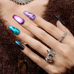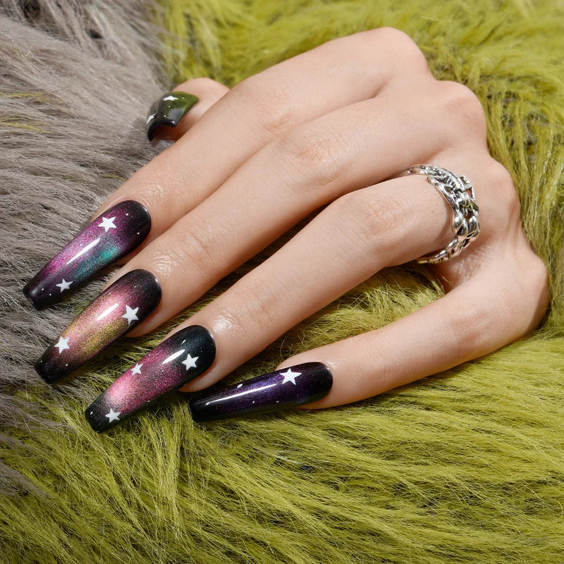 You can use black gel as a base and cat eye gel to get the desired effect, or you can apply cat eye gel directly and use a magnet stone to get the effect you want.