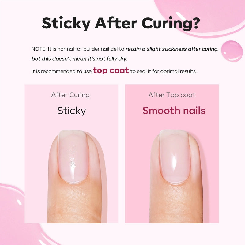 If gel top coats leave a sticky residue. Use a lint-free pad with nail cleanser or alcohol to gently wipe it off for a glossy finish.