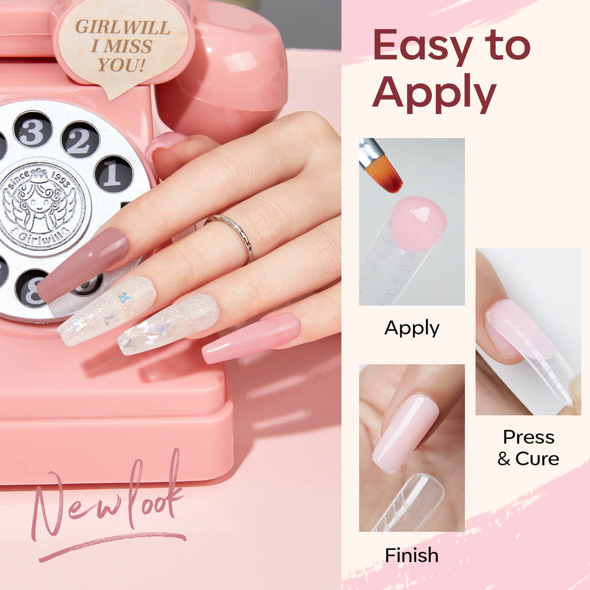 Spread the Poly Nail Gel evenly on the dual form and press on your nails. Remove the dual form after curing and buff to your favorite nail shape.