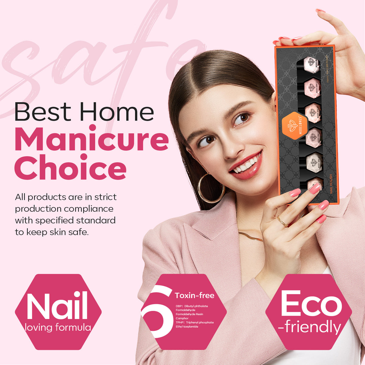 Environmental & Healthy: 6 Toxin Free Ingredient which makes it safe and has low odor. No harsh ingredients or adhesives that lead to damaged nails.